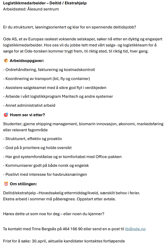Ode AS utlyser nå stilling som logstikkmedarbeider i Ålesund. Se stillingsannonse under: